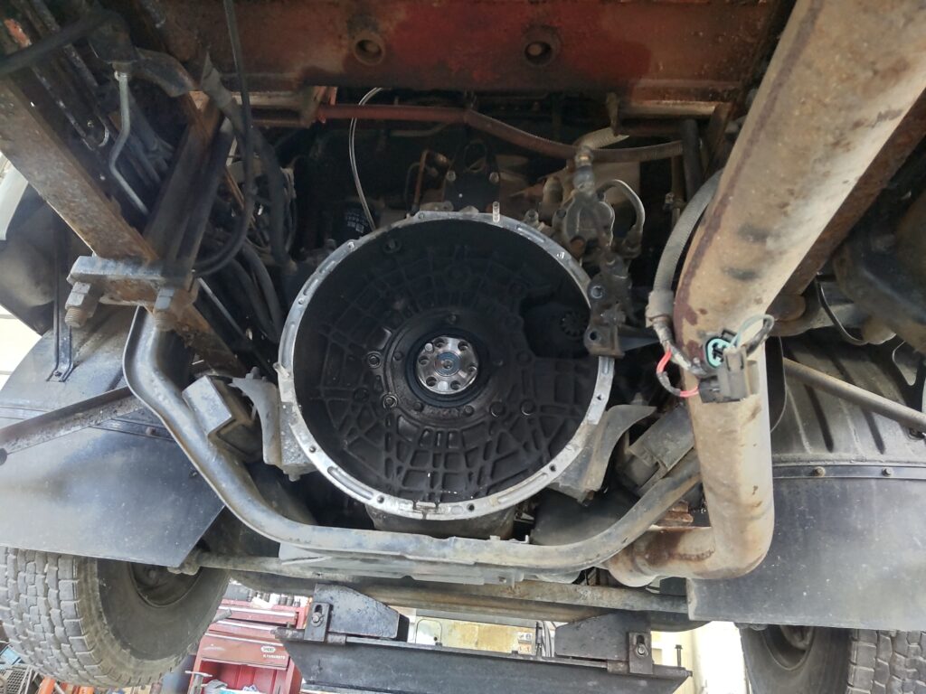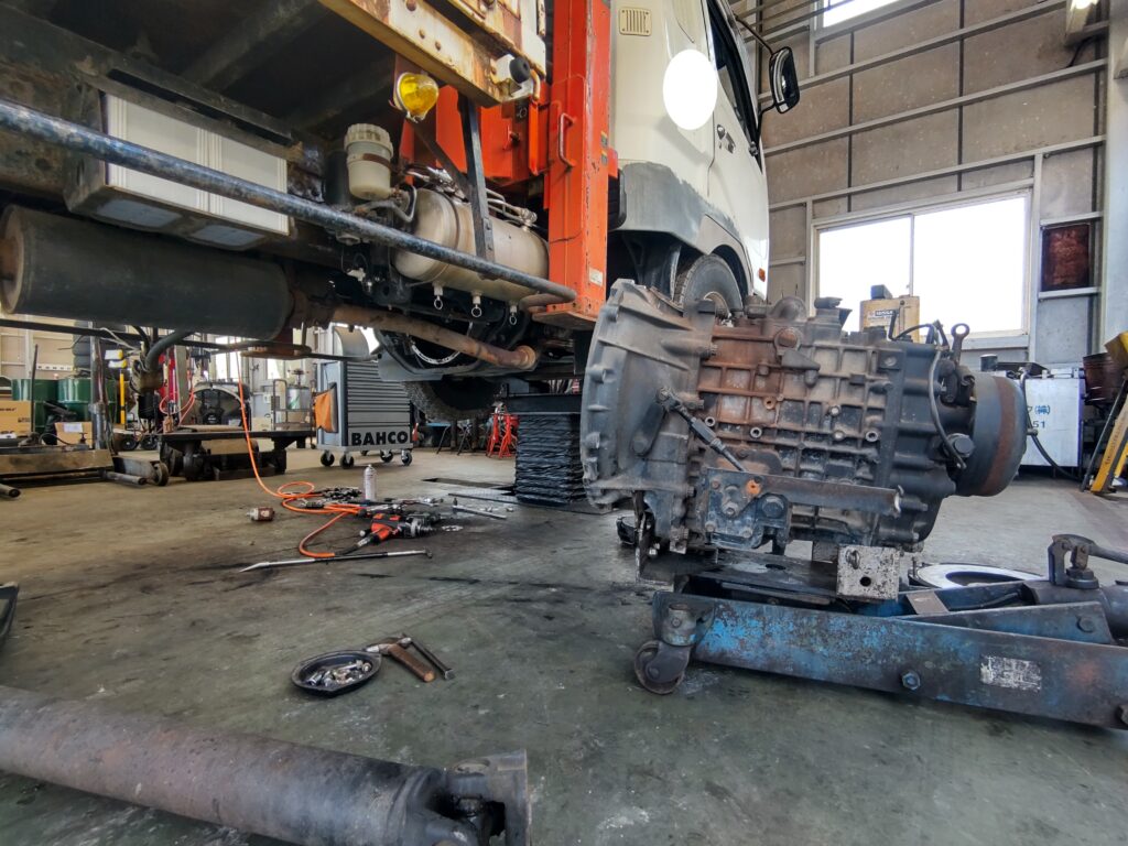 クレーンが前に格納されてしまっていますね クラッチが滑ると、PTOも入りませんのでクレーンの操作が出来ません