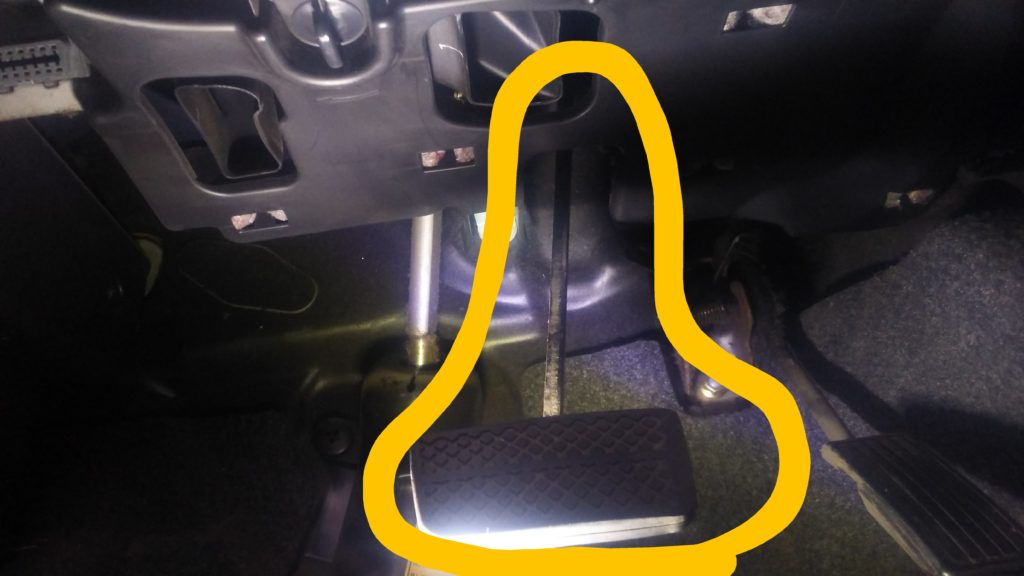 赤矢印がブレーキペダルです 黄色矢印がブレーキを踏んでるか判断するスイッチです